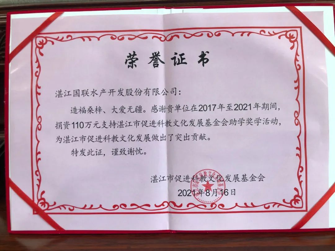 扶貧先扶志,扶貧重扶智。據(jù)悉,國(guó)聯(lián)水產(chǎn)集團(tuán)先后共捐贈(zèng)慈善公益項(xiàng)目約4000多萬(wàn)元。2021年,國(guó)聯(lián)水產(chǎn)集團(tuán)向湛江市促進(jìn)科教文化發(fā)展基金會(huì)捐款110萬(wàn)元,為湛江科教文化發(fā)展盡心盡力。愛(ài)心無(wú)止境,公益事業(yè)亦無(wú)止境。未來(lái),國(guó)聯(lián)水產(chǎn)集團(tuán)始終如一,將源源不斷的輸出愛(ài)心,聚沙成塔,以愛(ài)心繼續(xù)溫暖中華大地!
